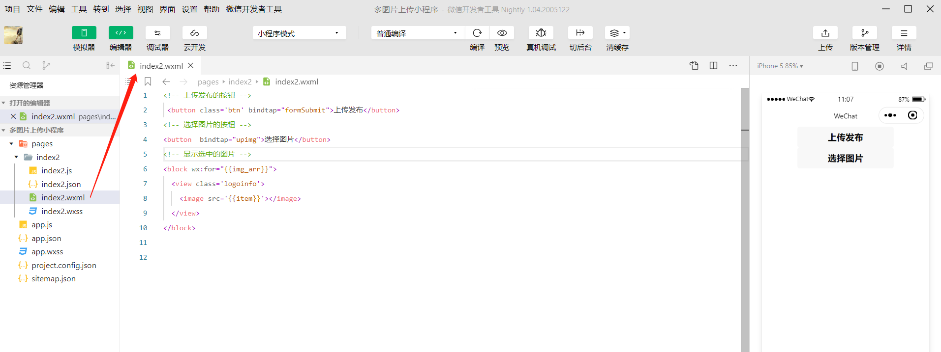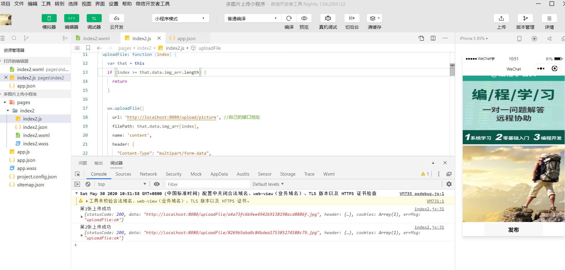 其实这两个截图就可以看出,我们图片上传成功了,并且给小程序前端返回了可供访问的图片url。 话不多说,直接看代码。