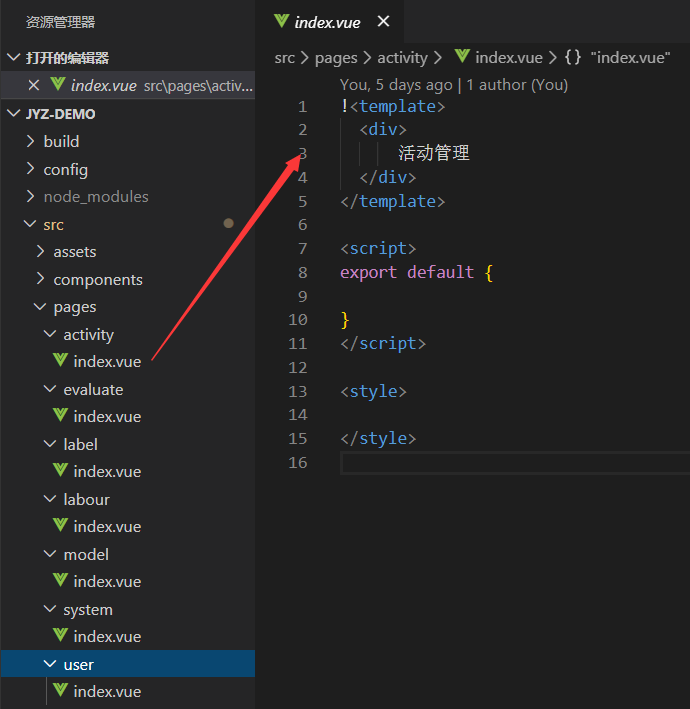 在每一个对应的文件夹都建立index.vue页面,并使用快捷键建立vue模板文件代码