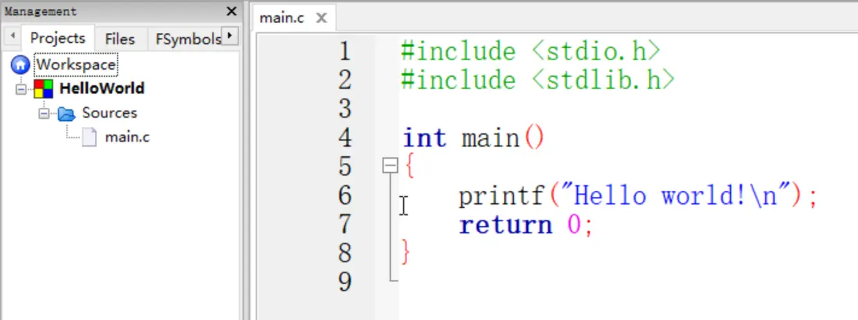 如上图,你可以看到,这个项目(在 Projects 一栏里)只有一个文件:main.c 。
