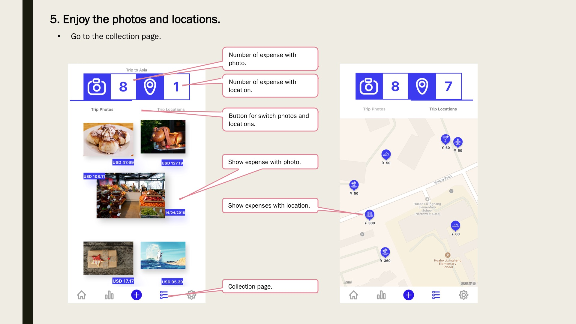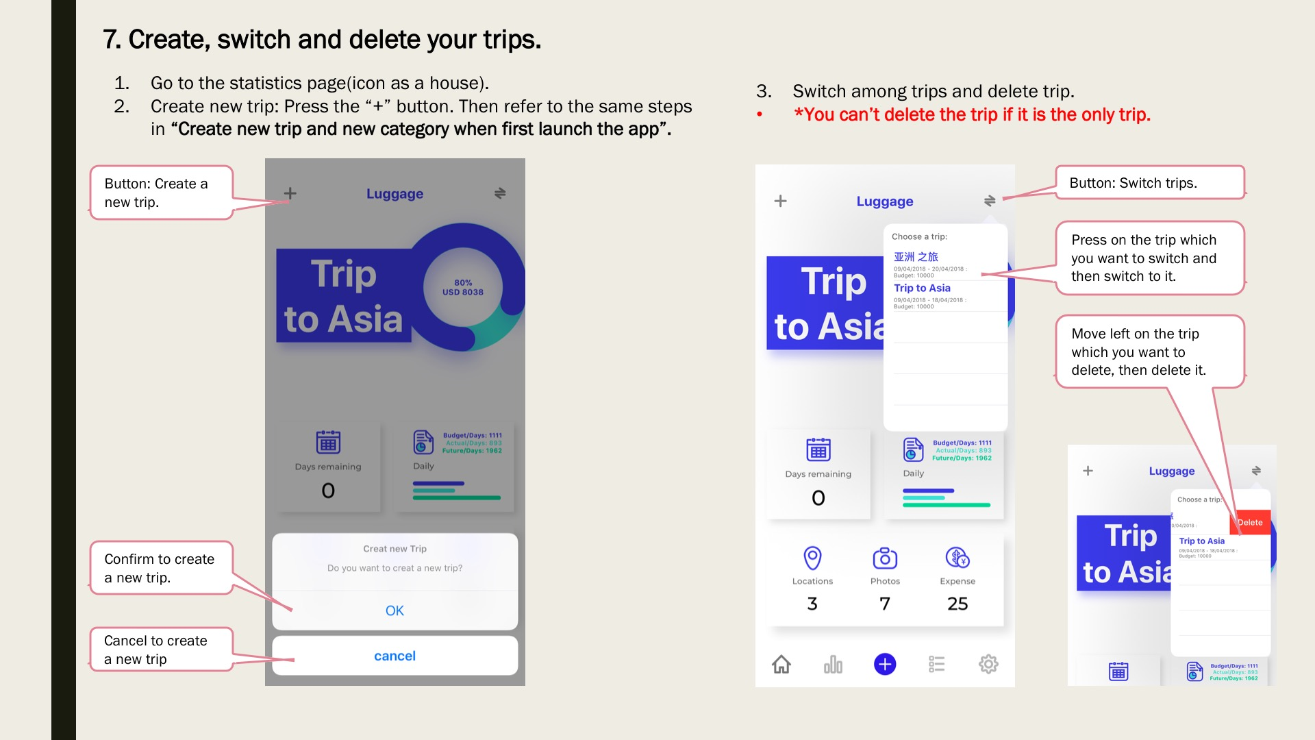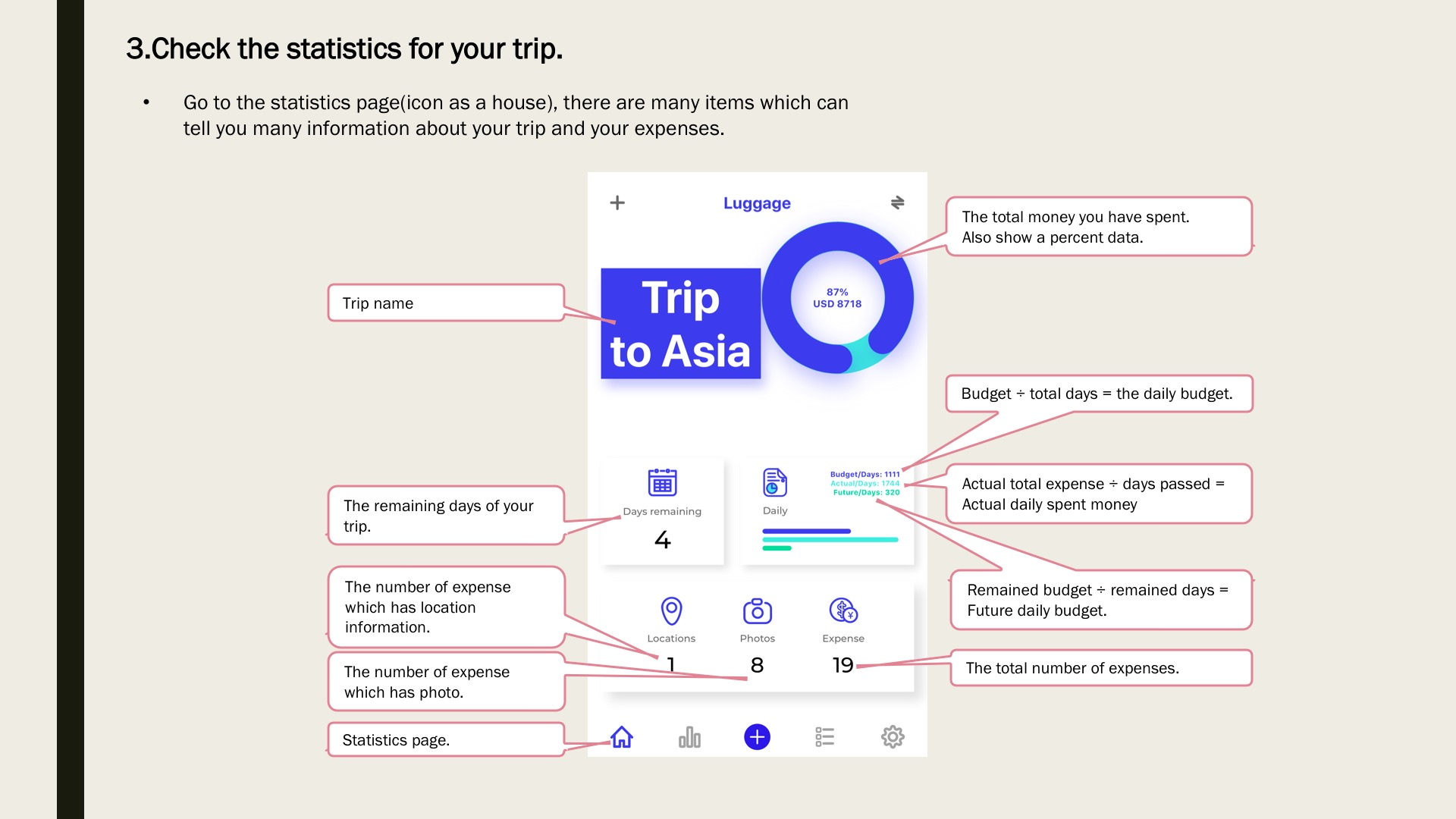 “Luggage” will help you to record theexpense which spent during the journey by not only classifying but alsolocations and photos. What’s more, “Luggage” also calculate the total expense,average daily expense and use line/Pie chart to make you fully understand whereyour budget goes.