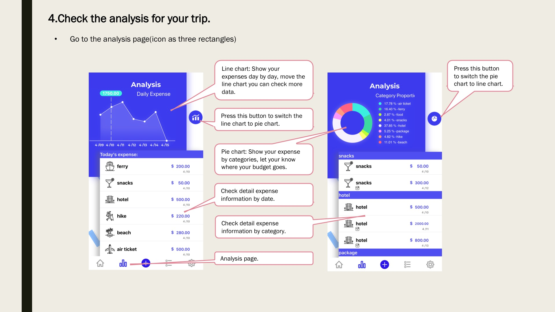 *Calculate total expense, daily expense,make Line/Pie chart to show the statistics.
