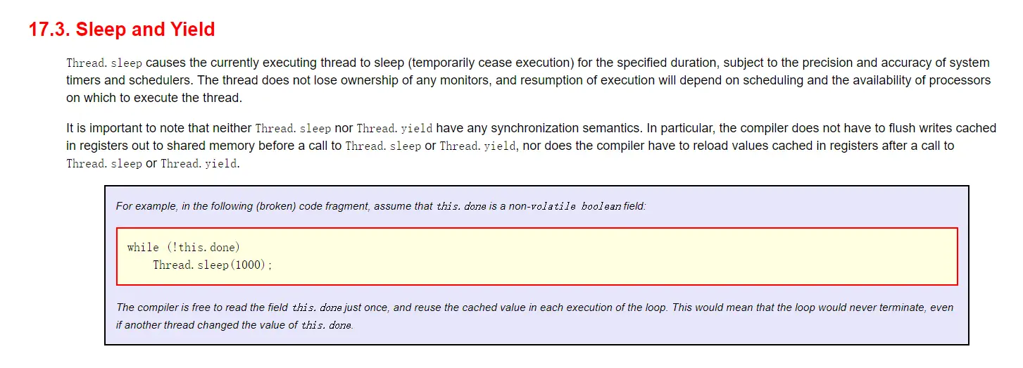 官方文档上是说,Thread.sleep没有任何同步语义,编译器不需要在调用Thread.sleep之前把缓存在寄存器中的写刷新到给共享内存、也不需要在Thread.sleep之后重新加载缓存在寄存器中的值。