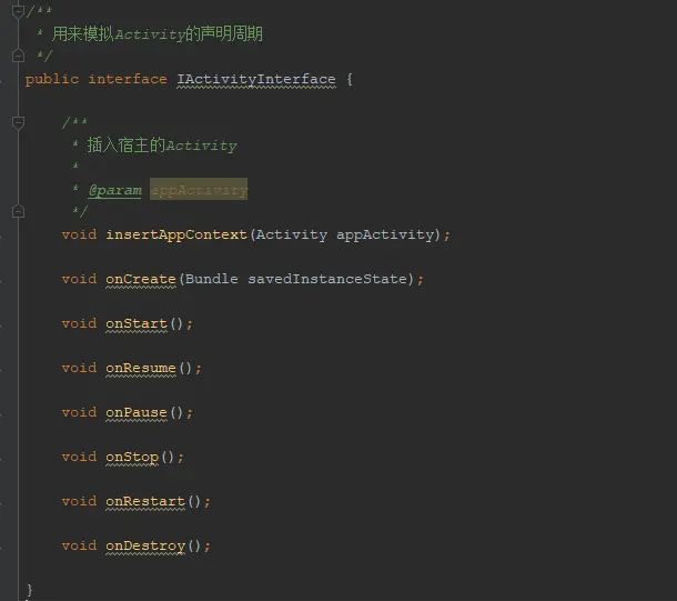 由于插件apk是没有安装的,也就是插件apk没有组件的一些环境,比如context上下文对象之类的,如果要用到这些环境就必须依赖宿主的环境运行。所以我们就要宿主跟插件之间定义一个标准。用来传递宿主中的环境给插件。