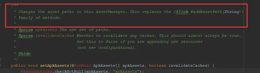 阅读源码发现,AssetManager类里面要更改资源路径就必须要调用 addAssetPath 方法。从这里得出我们可以反射拿到这个方法,然后传入插件apk的资源路径即可。