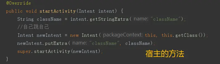 跳转成功后,我们就要实现插件中的Activity跳转到插件中的另一个Activity了。大家都知道跳转Activity的话我们都要执行startActivity() 方法,而查看源码而知,startActivity() 里调用了 this.startActivity(intent, null);这里的 this表示着上下文对象,但是我们的插件APP没有上下文对象的环境,如果执行了 startActivity() 方法肯定会发生崩溃的,那么怎样才能避免崩溃,并且成功跳转呢。其实非常简单,我们只要使用宿主APP的环境就可以来实现该功能了,只不过是稍微有些麻烦。我们需要重写 startActivity() 方法,并且传递我们需要跳转的Activity的全类名给宿主,且跳转的方法交给我们的宿主来进行就可以了,然后我们重写宿主APP的代理Activity 的startActivity() 方法用来接收插件APP传递过来的全类名,最后执行宿主APP的代理Activity 的startActivity() 方法即可。如下: