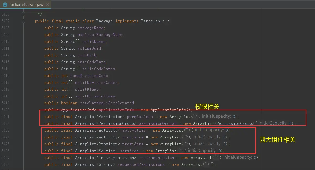 跟踪源码发现,执行到 packageParser.parsePackage() 这个方法的时候会返回一个 PackageParser.Package 对象,我们进去查看一下 PackageParser 这个类的源码,发现 Package 是其里面的静态内部类。