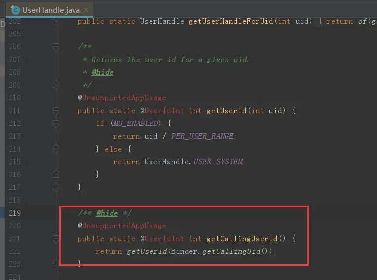 现在就剩下最后一个参数了,就是我们的userId,到底怎么获取这个参数值呢?其实我们可以从 android.os.UserHandle 这个类入手,分析该类得出的结果