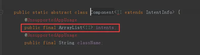 在第一步我们获取到了 receivers 这个广播集合,有了这个集合我们就可以拿到里面的广播来进行注册了。我们先来看看先跟到这个 List<Activity> 尖括号里面的对象,发现这个Activity 不是我们四大组件的Activity,它纯粹是为了封装这些数据的Java bean,所以千万不要把它搞混了。