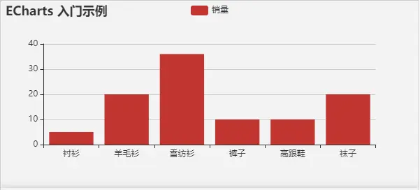 然后就可以通过 echarts.init 方法初始化一个 echarts 实例并通过 setOption 方法生成一个简单的柱状图,下面是完整代码。