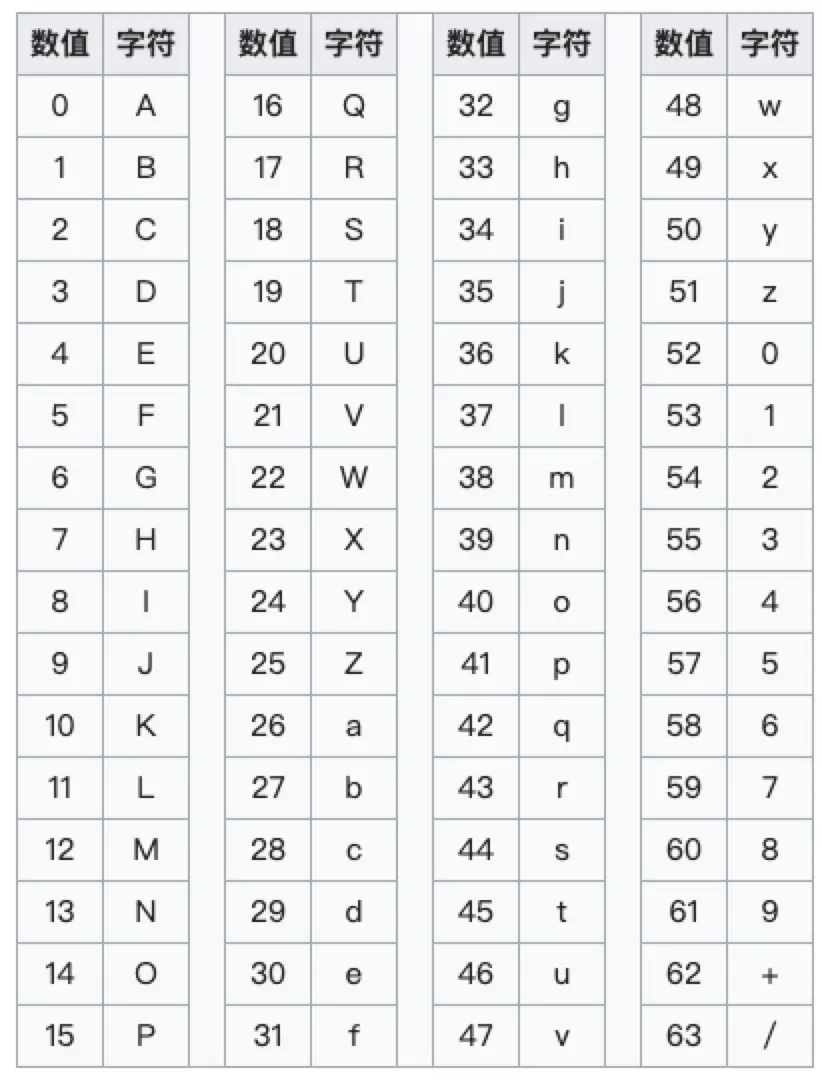 Base64是一种表示二进制的方法,有64个可打印字符,取值为A-Za-z0-9+/。