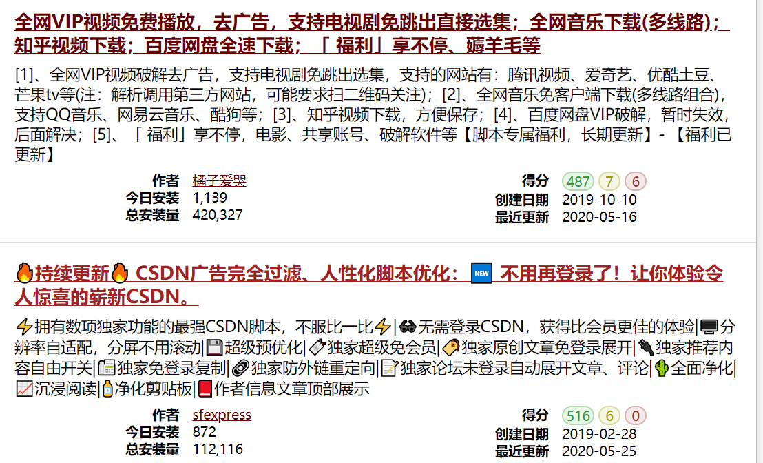 Tampermonkey 可以说是一款神奇插件,简称为油猴,可以在上面安装各种脚本,如屏蔽网页广告,网盘全速下载,免费观看腾讯、优酷、爱奇艺等各大视频网站VIP电影,免费下载酷狗、腾讯等音乐网站歌曲,免费下载文库文档,领取京东、天猫购物券,购物比价等等,当然你也可以自己写脚本。