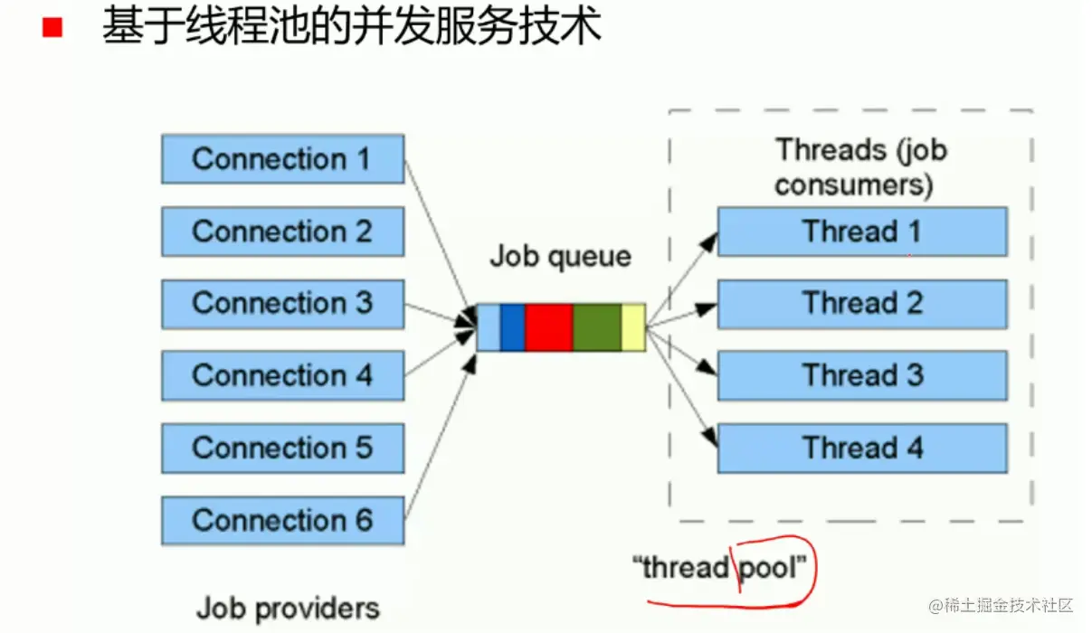 该方案建立了一个能够暂存客户端请求的请求队列,并建立了保留多个线程的线程池。在没有收到请求时,线程池中的线程处于休眠状态,接收到请求时则会被唤醒并进行服务。该方法相较于上一个直接创建线程的方案能有效提升性能