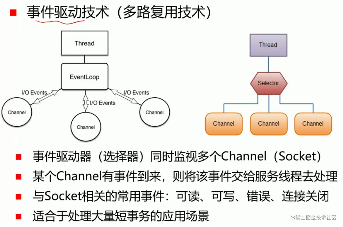 事件驱动技术的核心思想,是把客户端的请求分成一个个小事件,然后在少数的线程中串行解决这些小事件。