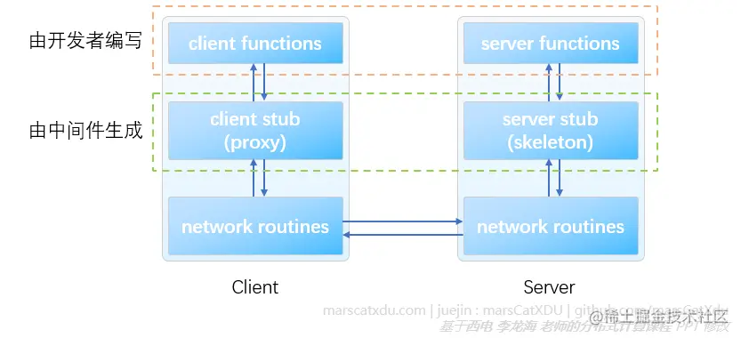 RPC 中间件会在我们的 client 进程中生成叫做 proxy (代理)或者 client stub (存根)的模块。在 server 端生成一个 skeleton。