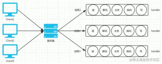 服务器每收到一个请求,就创建一个服务于该请求的线程来进行服务,有多个请求就创建多个线程。
