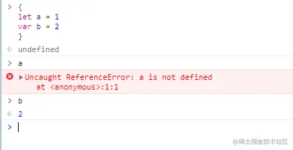 在代码块内使用let声明时,外部是无法读取到内部声明的变量的