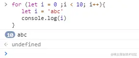 需要特别注意的是:在for循环内,设置循环变量的那一部分为父作用域,而循环体内为一个子作用域 ,所以,上图代码会打印出10个 'abc' ,而不是 0 到 9