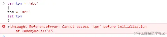在块级作用域内,我们声明了一个变量tmp,所以该变量会绑定在这个作用域内,不会受全局变量tmp的影响,而且,由于tpm在被赋值时还未被声明,所以会报错。同时,也造成了一个暂时性死区。