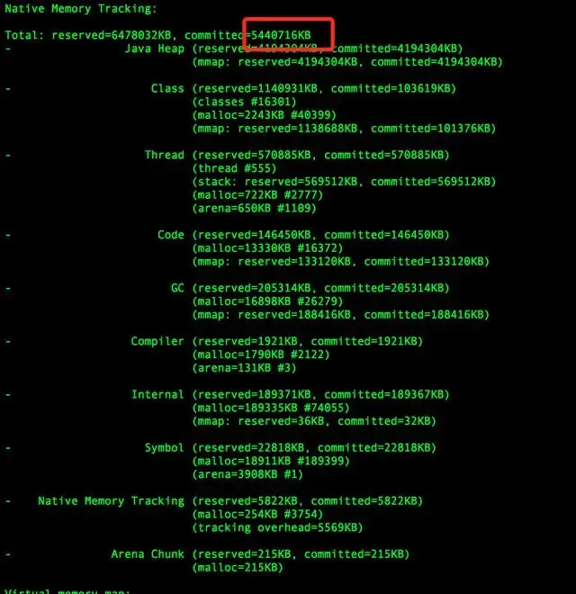 发现命令显示的committed的内存小于物理内存,因为jcmd命令显示的内存包含堆内内存、Code区域、通过unsafe.allocateMemory和DirectByteBuffer申请的内存,但是不包含其他Native Code(C代码)申请的堆外内存。所以猜测是使用Native Code申请内存所导致的问题。
