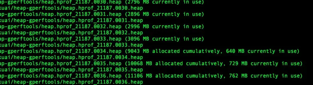 这时,再返过来看gperftools的内存分布情况,发现使用Spring Boot时,内存使用一直在增加,突然某个点内存使用下降了好多(使用量直接由3G降为700M左右)。这个点应该就是GC引起的,内存应该释放了,但是在操作系统层面并没有看到内存变化,那是不是没有释放到操作系统,被内存分配器持有了呢?