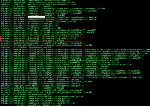 这里基本上就可以看出问题来了:MCC(美团统一配置中心)使用了Reflections进行扫包,底层使用了Spring Boot去加载JAR。因为解压JAR使用Inflater类,需要用到堆外内存,然后使用Btrace去追踪这个类,栈如下: