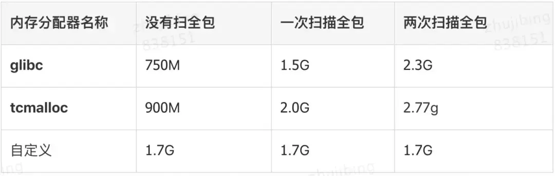 笔者做了一下测试,使用不同分配器进行不同程度的扫包,占用的内存如下: