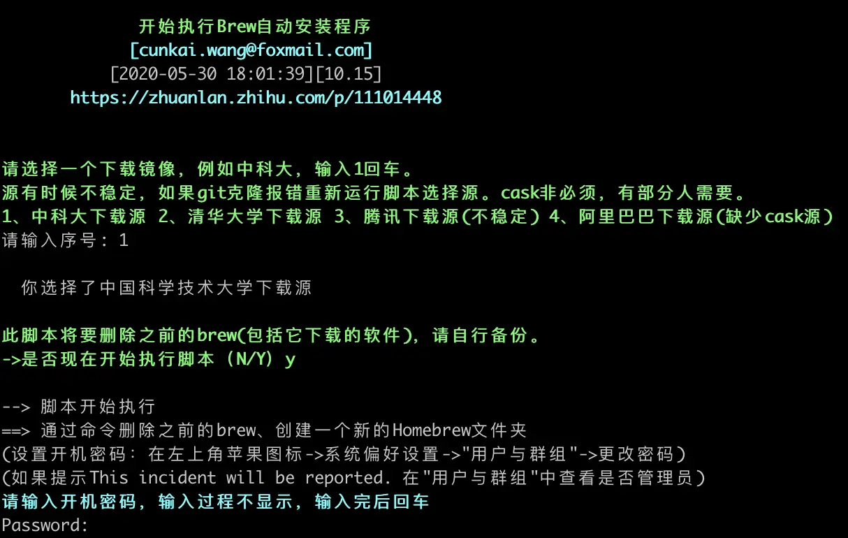 使用国内镜像: /bin/zsh -c "$(curl -fsSL gitee.com/cunkai/Home…)"