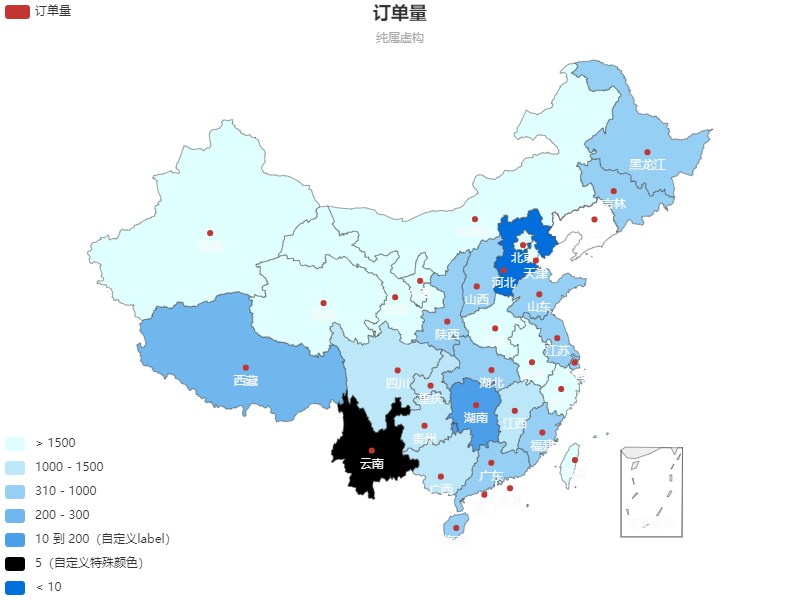 let option = { title: { text: '订单量', subtext: '纯属虚构', x: 'center' }, tooltip: { trigger: 'item' }, legend: { orient: 'vertical', x: 'left', data: ['订单量'] }, dataRange: { x: 'left', y: 'bottom', splitList: [ { start: 1500 }, { start: 900, end: 1500 }, { start: 310, end: 1000 }, { start: 200, end: 300 }, { start: 10, end: 200, label: '10 到 200(自定义label)' }, { start: 5, end: 5, label: '5(自定义特殊颜色)', color: 'black' }, { end: 10 } ], color: ['#E0022B', '#E09107', '#A3E00B'] }, toolbox: { show: true, orient: 'vertical', x: 'right', y: 'center', feature: { mark: { show: true }, dataView: { show: true, readOnly: false }, restore: { show: true }, saveAsImage: { show: true } } }, roamController: { show: true, x: 'right', mapTypeControl: { 'china': true } }, series: [ { name: '订单量', type: 'map', mapType: 'china', roam: false, itemStyle: { normal: { label: { show: true, textStyle: { color: "rgb(249, 249, 249)" } } }, emphasis: { label: { show: true } } }, data: [ { name: '北京', value: Math.round(Math.random() * 2000) }, { name: '天津', value: Math.round(Math.random() * 2000) }, { name: '上海', value: Math.round(Math.random() * 2000) }, { name: '重庆', value: Math.round(Math.random() * 2000) }, { name: '河北', value: 0 }, { name: '河南', value: Math.round(Math.random() * 2000) }, { name: '云南', value: 5 }, { name: '辽宁', value: 305 }, { name: '黑龙江', value: Math.round(Math.random() * 2000) }, { name: '湖南', value: 200 }, { name: '安徽', value: Math.round(Math.random() * 2000) }, { name: '山东', value: Math.round(Math.random() * 2000) }, { name: '新疆', value: Math.round(Math.random() * 2000) }, { name: '江苏', value: Math.round(Math.random() * 2000) }, { name: '浙江', value: Math.round(Math.random() * 2000) }, { name: '江西', value: Math.round(Math.random() * 2000) }, { name: '湖北', value: Math.round(Math.random() * 2000) }, { name: '广西', value: Math.round(Math.random() * 2000) }, { name: '甘肃', value: Math.round(Math.random() * 2000) }, { name: '山西', value: Math.round(Math.random() * 2000) }, { name: '内蒙古', value: Math.round(Math.random() * 2000) }, { name: '陕西', value: Math.round(Math.random() * 2000) }, { name: '吉林', value: Math.round(Math.random() * 2000) }, { name: '福建', value: Math.round(Math.random() * 2000) }, { name: '贵州', value: Math.round(Math.random() * 2000) }, { name: '广东', value: Math.round(Math.random() * 2000) }, { name: '青海', value: Math.round(Math.random() * 2000) }, { name: '西藏', value: Math.round(Math.random() * 2000) }, { name: '四川', value: Math.round(Math.random() * 2000) }, { name: '宁夏', value: Math.round(Math.random() * 2000) }, { name: '海南', value: Math.round(Math.random() * 2000) }, { name: '台湾', value: Math.round(Math.random() * 2000) }, { name: '香港', value: Math.round(Math.random() * 2000) }, { name: '澳门', value: Math.round(Math.random() * 2000) } ] } ] }; -