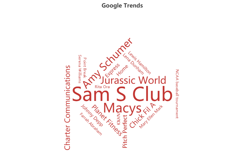 // 字符云 wordCloud () { let myChart = this.$echarts.init(this.$refs.wordCloud) // 这个是返回的一个随机颜色,调用到了potion配置里 function createRandomItemStyle () { return { normal: { color: 'rgb(' + [ Math.round(Math.random() * 160), Math.round(Math.random() * 160), Math.round(Math.random() * 160) ].join(',') + ')' } }; } let option = { title: { text: 'Google Trends', link: 'http://www.google.com/trends/hottrends', left: 'center' }, tooltip: { show: true }, series: [{ name: 'Google Trends', type: 'wordCloud', size: ['80%', '80%'], textRotation: [0, 45, 90, -45], textPadding: 0, autoSize: { enable: true, minSize: 14 }, data: [ { name: "Sam S Club", value: 10000, itemStyle: { normal: { color: 'black' } } }, { name: "Macys", value: 6181, itemStyle: createRandomItemStyle() }, { name: "Amy Schumer", value: 4386, itemStyle: createRandomItemStyle() }, { name: "Jurassic World", value: 4055, itemStyle: createRandomItemStyle() }, { name: "Charter Communications", value: 2467, itemStyle: createRandomItemStyle() }, { name: "Chick Fil A", value: 2244, itemStyle: createRandomItemStyle() }, { name: "Planet Fitness", value: 1898, itemStyle: createRandomItemStyle() }, { name: "Pitch Perfect", value: 1484, itemStyle: createRandomItemStyle() }, { name: "Express", value: 1112, itemStyle: createRandomItemStyle() }, { name: "Home", value: 965, itemStyle: createRandomItemStyle() }, { name: "Johnny Depp", value: 847, itemStyle: createRandomItemStyle() }, { name: "Lena Dunham", value: 582, itemStyle: createRandomItemStyle() }, { name: "Lewis Hamilton", value: 555, itemStyle: createRandomItemStyle() }, { name: "KXAN", value: 550, itemStyle: createRandomItemStyle() }, { name: "Mary Ellen Mark", value: 462, itemStyle: createRandomItemStyle() }, { name: "Farrah Abraham", value: 366, itemStyle: createRandomItemStyle() }, { name: "Rita Ora", value: 360, itemStyle: createRandomItemStyle() }, { name: "Serena Williams", value: 282, itemStyle: createRandomItemStyle() }, { name: "NCAA baseball tournament", value: 273, itemStyle: createRandomItemStyle() }, { name: "Point Break", value: 265, itemStyle: createRandomItemStyle() } ] }] }; myChart.setOption(option) }, -