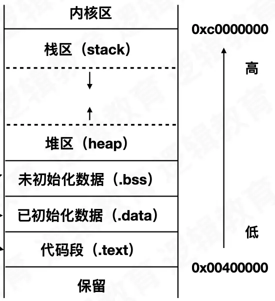 内存分区:代码段、数据段、BSS段,栈区,堆区。栈区地址一般为0x7开头,堆区地址一般为0x6开头。数据段一般0x1开头。