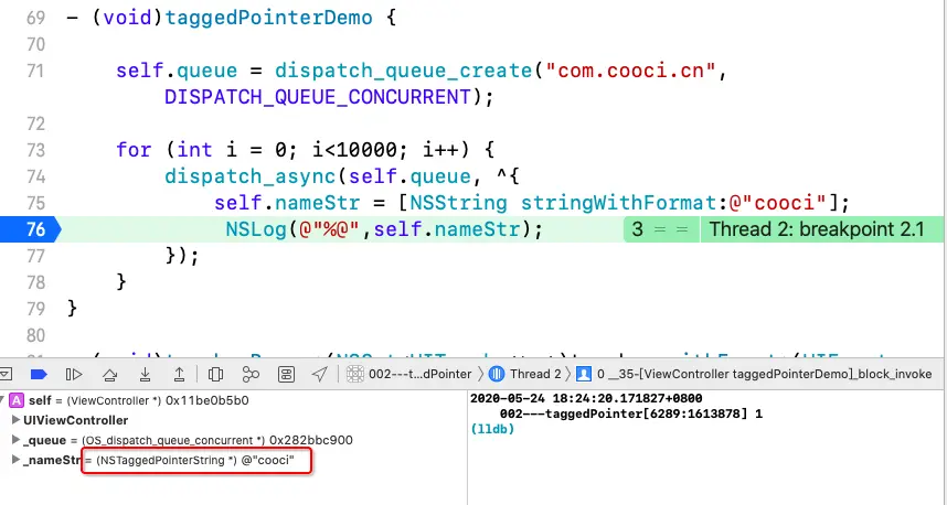 通过上面的断点调试,发现第一段代码中_nameStr的类型并不是NSString而是taggedPointer类型,而第二段中是NSString类型。