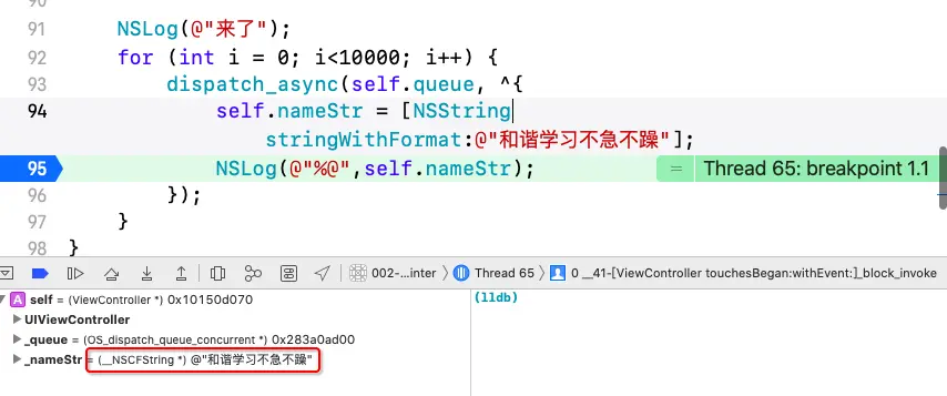 在release时,先判断是否是isTaggedPointer,是,则直接返回,并没有真的进行release操作,而在retain时也是同样的操作,先判断isTaggedPointer,并没有进行retain,这也就解释了为什么第一段代码能正常执行,因为其底层并没有retain和release,即使搭配多线程,也不会出现多次释放的问题,也就不会出现野指针,也不会崩溃。