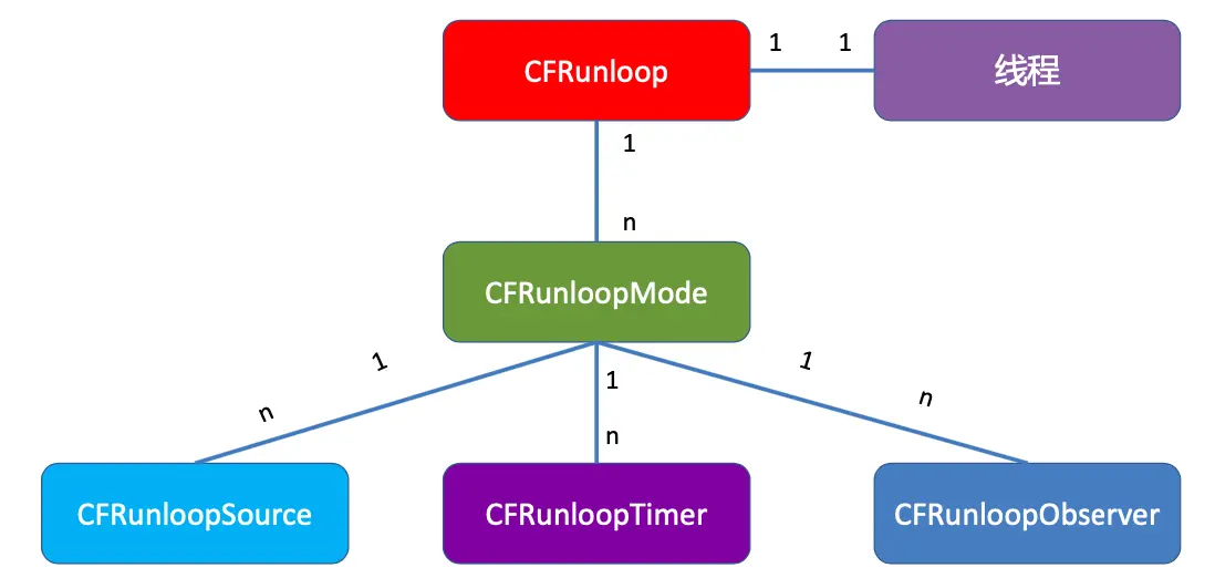 runLoop和线程一对一绑定,runLoop底层依赖一个CFRunLoopMode,是一对多的关系,而commonModes中的items(比如:source、timer、observe)也是一对多的关系。