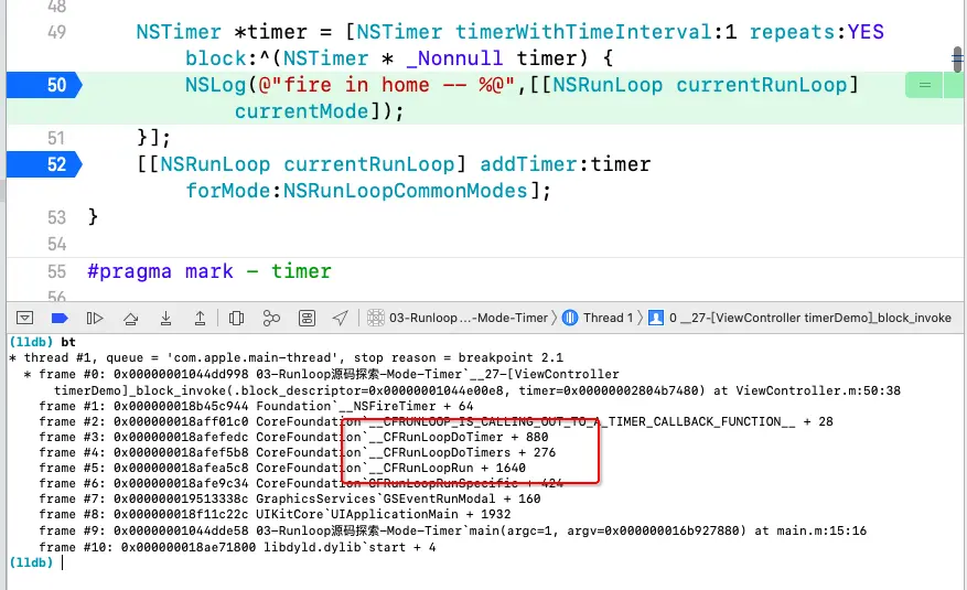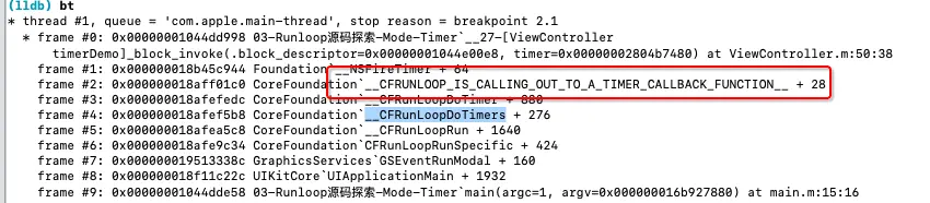 接下来,我们以NSTimer为例,分析一下是如何回调的,首先如下断点,打印调用堆栈,