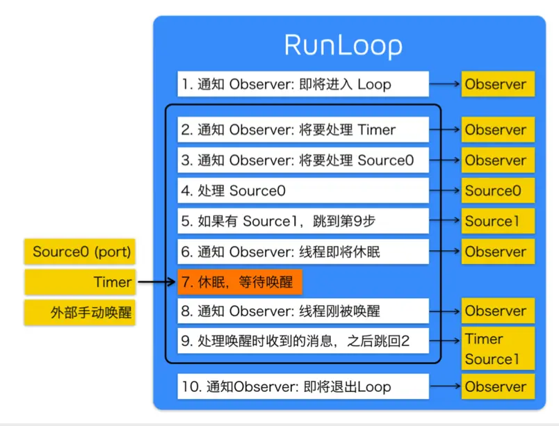Observers:RunLoop的线程即将进入休眠(sleep)。然后设置RunLoop为休眠状态