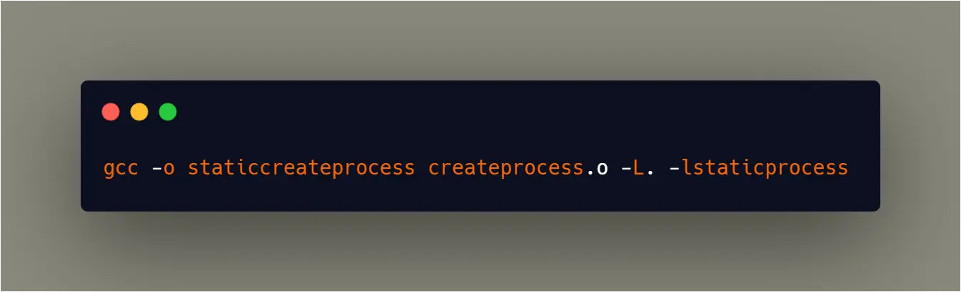 上面命令中"-L"代表默认在当前目录寻找.a文件,然后取出.o文件和creteprocess.o做连接形成二进制执行文件 staticcreateprocess。