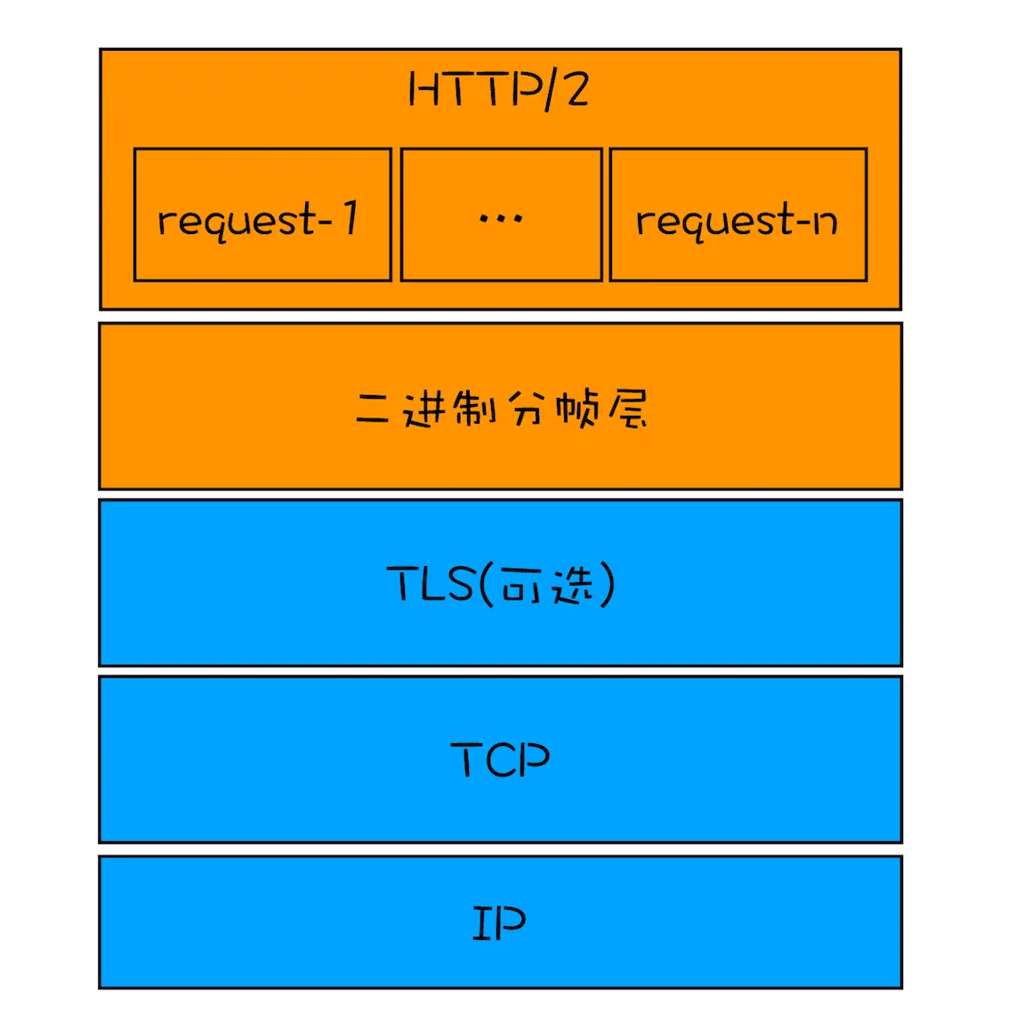 HTTP/2 添加了一个二进制分帧层;首先,浏览器准备好请求数据,包括了请求行、请求头等信息,如果是 POST 方法,那么还要有请求体。这些数据经过二进制分帧层处理之后,会被转换为一个个带有请求 ID 编号的帧,通过协议栈将这些帧发送给服务器。服务器接收到所有帧之后,会将所有相同 ID 的帧合并为一条完整的请求信息。然后服务器处理该条请求,并将处理的响应行、响应头和响应体分别发送至二进制分帧层。同样,二进制分帧层会将这些响应数据转换为一个个带有请求 ID 编号的帧,经过协议栈发送给浏览器。浏览器接收到响应帧之后,会根据 ID 编号将帧的数据提交给对应的请求。通过引入二进制分帧层,就实现了 HTTP 的多路复用技术。