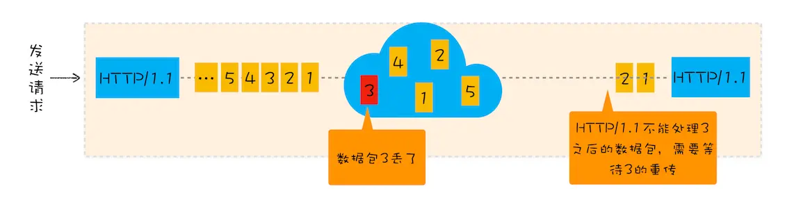 (1)TCP内部队头阻塞:HTTP/2受影响严重,有测试数据表明,当系统达到了 2% 的丢包率时,HTTP/1.1 的传输效率反而比 HTTP/2 表现得更好。