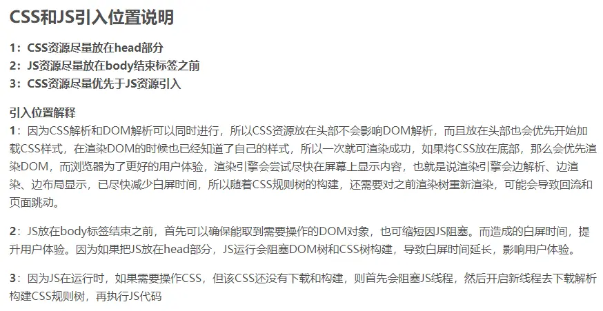 body底部;非操作DOM的JS按需使用defer或者async属性。CSS:对于代码量少且与首屏显示无关的改为内联JS并放在head(因为DOM解析和CSSOM解析可以同时进行,不会阻塞;而且这样解析到DOM的时候相应的CSS也已经下载完毕可以解析了,可以同时进行,减少重排);适当合并CSS资源(控制在14KB内);跟首屏显示无关的CSS,添加媒体-取消阻止显示标志;