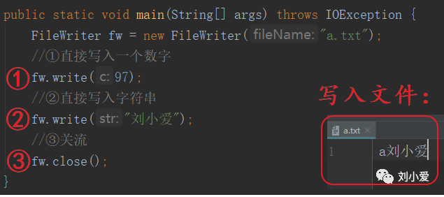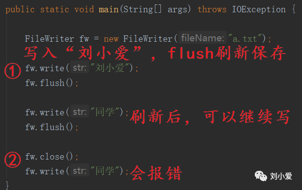 close方法,关流,它在关流时底层会调用flush方法。在使用close方法后,就不可以继续写入文件了。