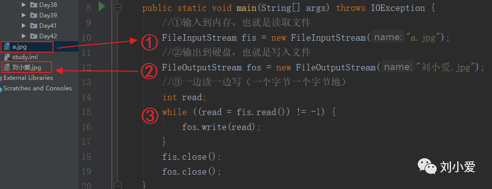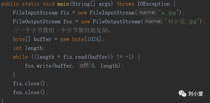 这样运行代码,就可以将“a.jpg”文件复制成“刘小爱.jpg”。 以上方法为一个字节一个字节地读取与写入,同样的道理,也可以一个字节数组一个字节数组地读取与写入。