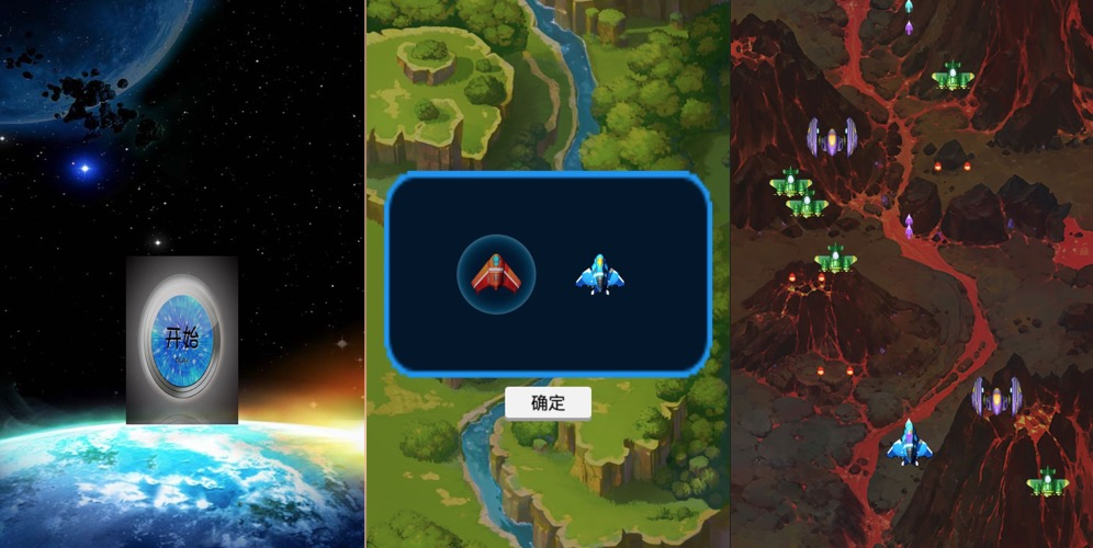 飞机大战的界面和流程比较简单,包括开始界面、战前准备(选择战机)、游戏主场景和游戏结束场景等界面,如图所示: