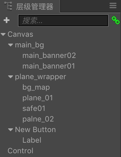 游戏主界面的层级结构主要有:背景层控制背景滚动、Control 主要是挂载主界面的逻辑.另外,主角飞机和敌机部分以及子弹都我在这里使用了预制资源 Prefab.