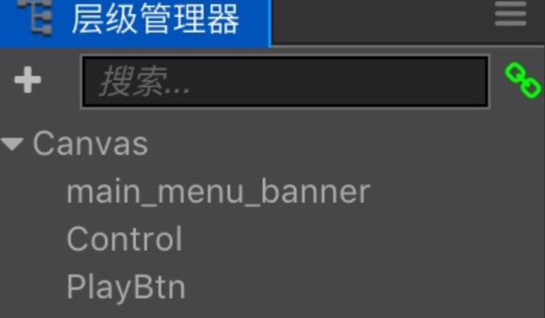 开始游戏的界面十分简单,包含一个界面背景、上层的开始游戏按钮,另外一个"Control"是一个空节点,用来放置开始界面逻辑组件的空节点.