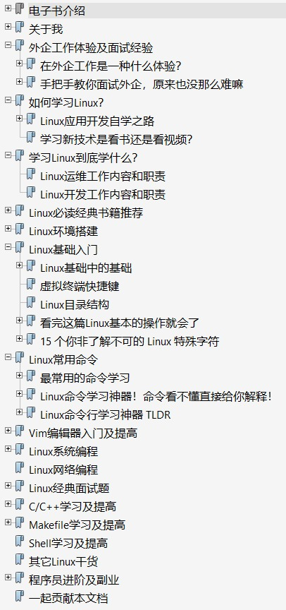 最后,最近很多小伙伴找我要Linux学习路线图,于是我根据自己的经验,利用业余时间熬夜肝了一个月,整理了一份电子书。无论你是面试还是自我提升,相信都会对你有帮助!目录如下: