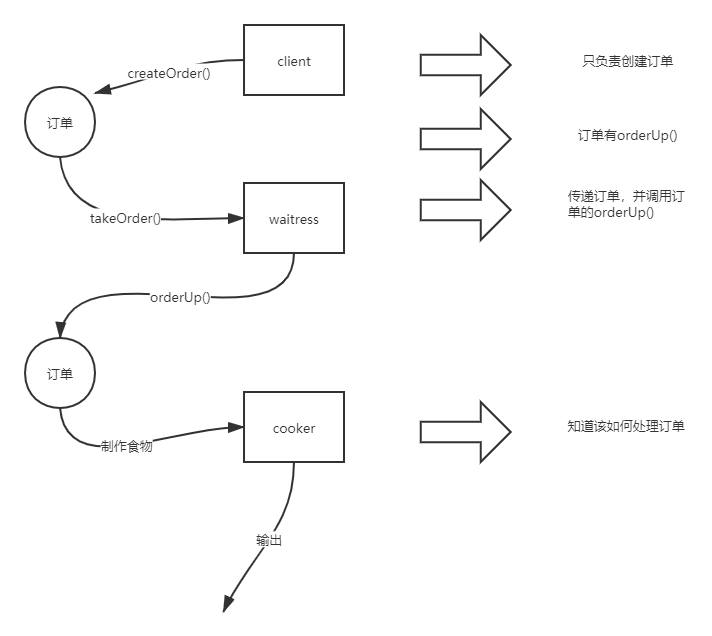 - 厨师是真正处理订单的对象,不需要和女招待有直接沟通,即女招待和厨师解耦