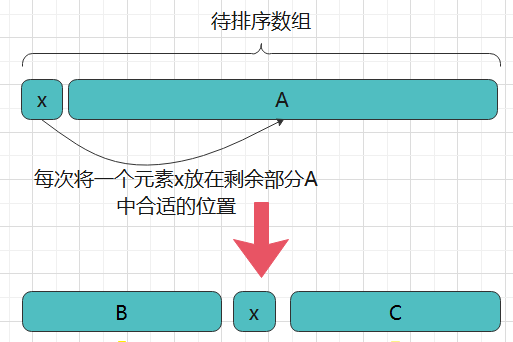 在数组内部进行排序,每次确定一个数的位置。以递增次序为例,每次移动一个数,使得它前面的数都比他小,后面的数都比它大(为了方便理解,假设数组没有相等的元素),而前半部分和后半部分内部的次序是不确定的。该过程如图所示: