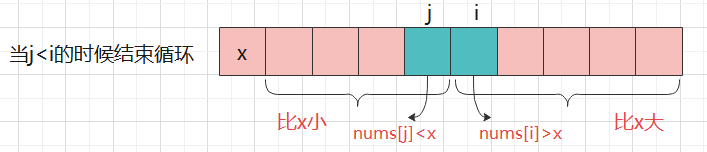 - 重复2,3,4步骤,直到i<j,这是后必定会停下来,因为j一旦在i的左边,j指向的元素肯定小于x,符合j停止的条件,i同理。