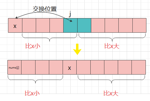 - 交换j指向元素和x的位置,这样就保证了x左边的元素都比x小,x右边的元素都比j大。