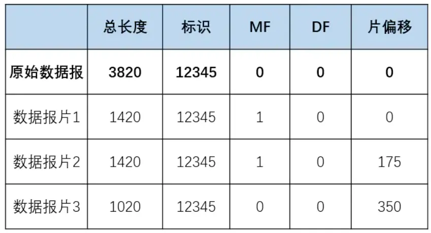 举个例子说明一下,假设一个数据报的总长度是3820个字节,其数据部分为3800字节长(首部仅仅使用固定部分),需要分片为长度不超过1420字节的数据报片。因固定首部长度为20字节,因此每个数据报片的长度不超过1400字节。于是分为3个报片,其数据部分的长度分别为1400、1400、1000字节。原始数据报首部被复制为各个数据报的首部,但是必须修改有关字段。
